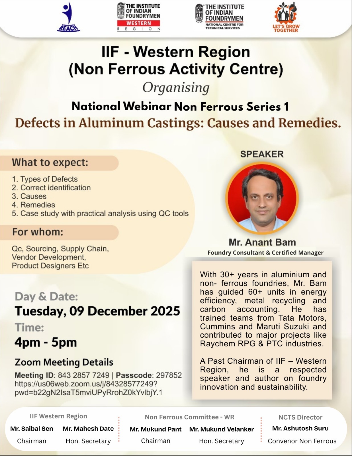 | Description | IIF – Western Region organizing a National Webinar Non-Ferrous Series-1 on “Defects in Aluminium Castings: Causes and Remedies” by Mr. Anant Bam on 9th December, 2025 Time: 4.00 PM. to 5.00 PM |