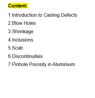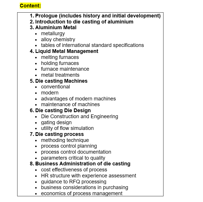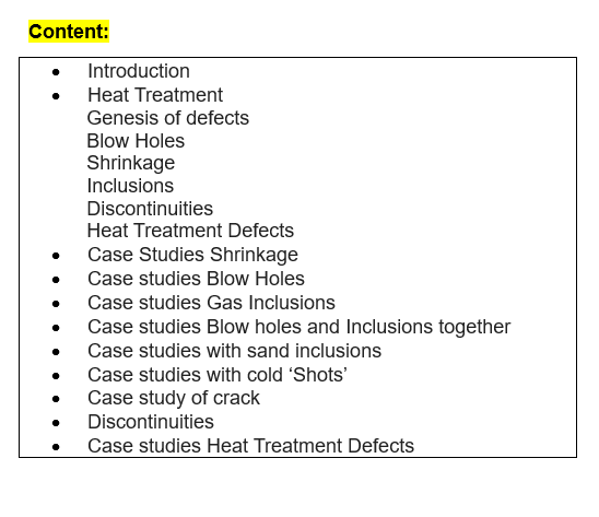International Specifications of various Aluminium Alloys; cause- effect analysis of most common defects namely Shrinkage; Blowholes; Inclusions; Cold Shuts; Solidification Cracks; Discontinuity and Heat Treatment Defects. There are numerous Case Studies amplifying cause – effect relationship. Special emphasis on methodology for accurate identification of defect.
