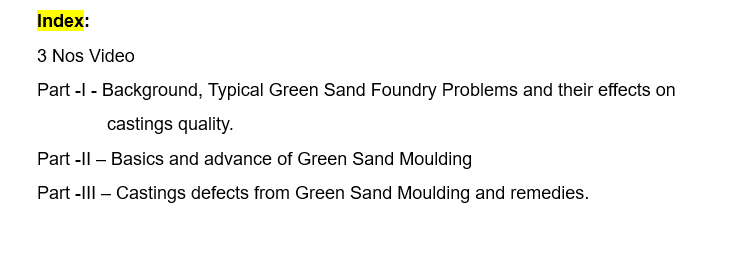 This is an interactive Pen Drive covering No Bake Molding Technology in its entirety. The Pen Drive covers all aspects of various No Bake Binders currently in use – from Sodium Silicate to Furan organic binders. The Pen Drive also covers various equipment used for producing high quality molds and cores made by using different core binders. The Pen Drive helps in selection of suitable binder for a given application. The Pen Drive also provides information on defects associated with No Bake Technology.