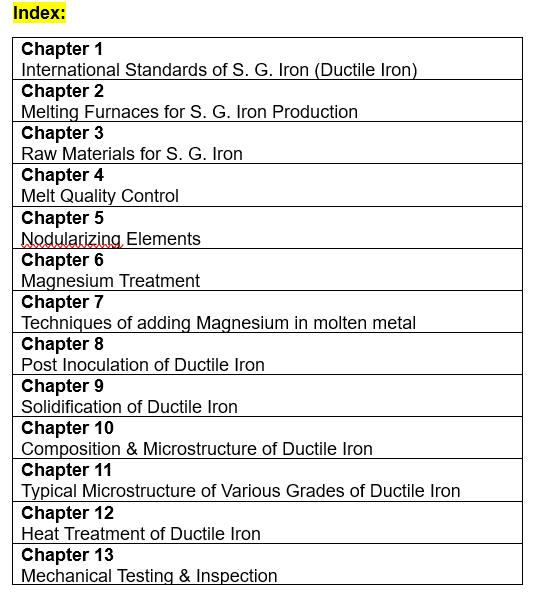 The Pen Drive introduces basics of SG Iron making and informs International standards. Mentions about furnaces and raw materials used, melt quality control, Mg treatment; Mg addition methods, post inoculation, Solidification, Metallography, Heat Treatment of SG Iron and Mechanical testing.