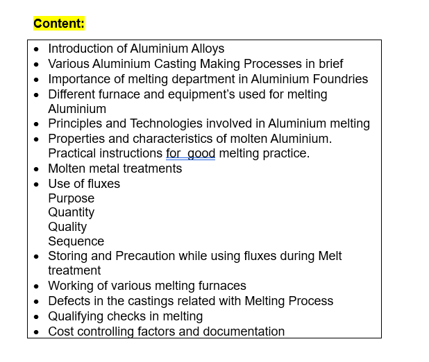 Types of Al alloys; principles of Al melting; characteristics of Al melt; types of Fluxes to be used and precautions required while using; degassing of Al melt - Different methods and precautions to be taken; Controls necessary for efficient Al Melting to ensure freedom from defects.