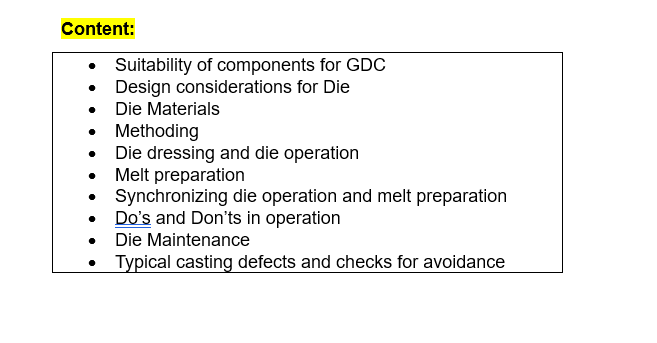 Suitability of components for GDC, Design considerations for Die, Die Materials, Methoding, Die dressing and die operation, Melt preparation, Synchronizing die operation and melt preparation, Do’s and Don’ts in operation, Die Maintenance, Typical casting defects and remedies.