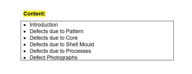 Complete coverage of shell moulding process- Raw Materials, Resin Coating Processes, Shell Moulding Machines, Pattern Design & Gating System, Shell Moulding Process Cycle, Testing of Resin Coated Sands, Defects in Shell Mould and Core Making, Shell Assembly; Defects in Shell Moulded Castings, Reclamation of Shell Sand, Typical Tests and Procedures.
