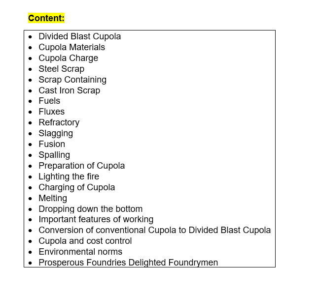 This is an outcome of detailed study of Efficient Cupola Design and Operation with the objective of Improving installed capacity utilization, Improving Casting yield, improving labour productivity, reducing energy consumption