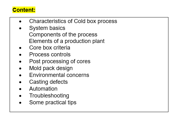 This is an interactive Pen Drive covering processes using Poly Eurethene polymers cured by Amine gas at Room Temp; it describes raw materials used, equipment available from conventional to Automatic and Robotic, process controls required, possible defects and the remedies. Numerous illustrations and elaborate video clips with voice support make this Pen Drive a very useful information source for beginners as well as practicing foundrymen.