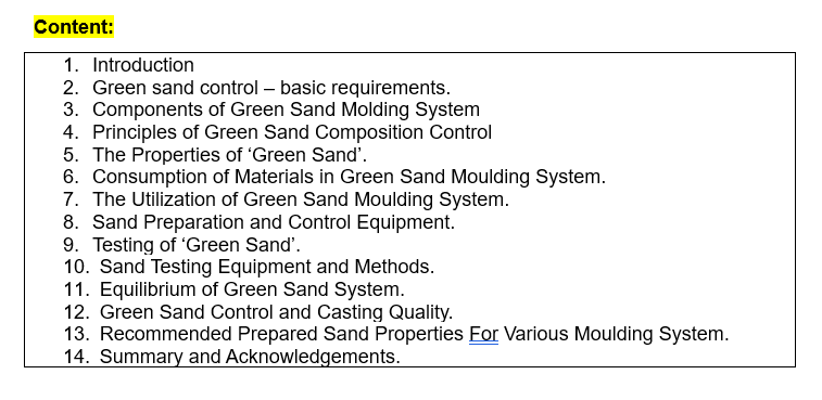 Compositions of green sand, mixing cycle, properties of green sand; checking sand properties. Use of control charts; defects related to moulding sand. Supplemented with exhaustive notes on green sand practice.