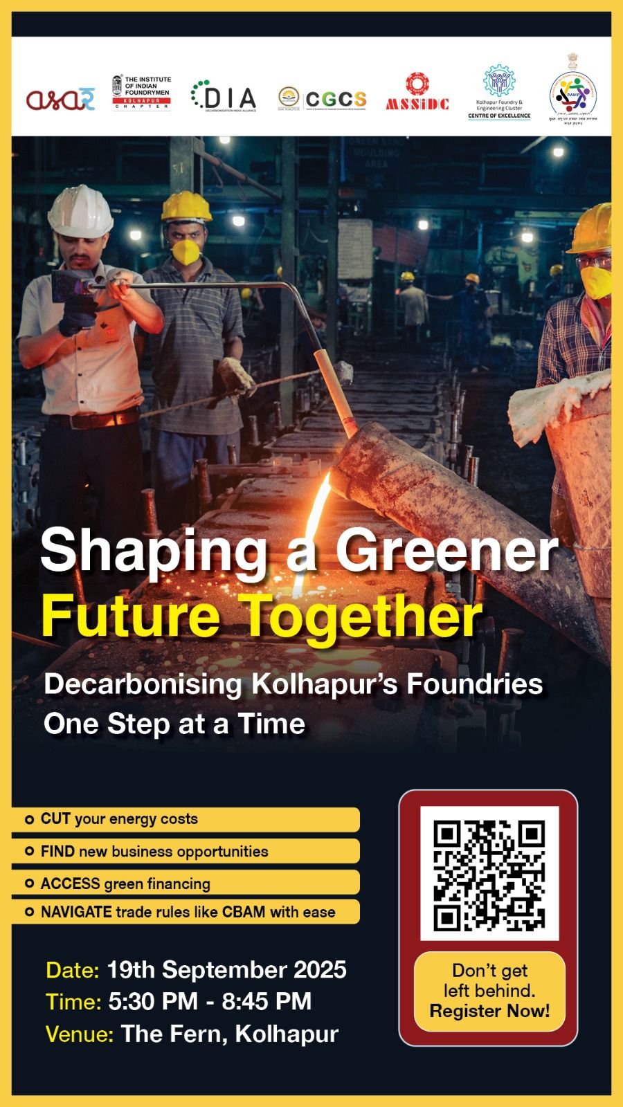 Description | An exclusive Invitation to a jointly organized program for Kolhapur’s foundry leaders. Join us for an evening dedicated to your foundry’s success and learn how sustainable efficiency can cut costs, meet future demands and grow your business. Why you should be there : Meet the Policymakers: Chief Guest : Shri Amol Yedge IAS, Collector & DM, Kolhapur Shri Nikhil Gharat RO - Kolhapur, MPCB Shri P Shyam Sunder Director, BEE Talk Finance : Get insights on green finance for energy efficiency and RE from SIDBI & others. Navigate New Export Rules : Learn about the EU’s Carbon Border Adjustment Mechanism (CBAM) and what it means for your business. Network with Leaders : Connect with peers and experts over discussions and dinner. |