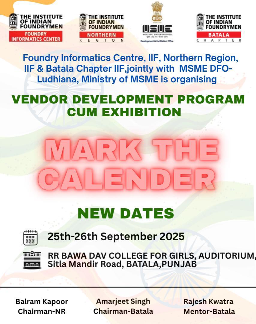 Description | Vendor Development Program Cum Exhibition on September 25th-26th, 2025, at RR Bawa DAV College for Girls, Batala, Punjab. This event aims to foster collaboration, growth and business opportunities between CPSUs, large casting buyers and foundry industry. |