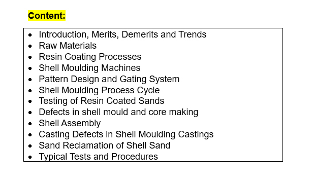 Complete coverage of shell moulding process- Raw Materials, Resin Coating Processes, Shell Moulding Machines, Pattern Design & Gating System, Shell Moulding Process Cycle, Testing of Resin Coated Sands, Defects in Shell Mould and Core Making, Shell Assembly; Defects in Shell Moulded Castings, Reclamation of Shell Sand, Typical Tests and Procedures.