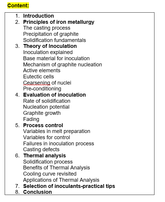 An interactive Pen Drive explaining theory of inoculation process. All parameters which affect efficiency of Inoculation are covered in minute details supported by facts and figures. Special chapter is devoted on practical aspects for ensuring good selection and use of chosen inoculant. This Pen Drive gives a practical insight to the behaviour of liquid cast iron melts when poured into moulds together with methodology to address metallurgical issues.