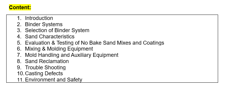 This is an interactive Pen Drive covering No Bake Molding Technology in its entirety. The Pen Drive covers all aspects of various No Bake Binders currently in use – from Sodium Silicate to Furan organic binders. The Pen Drive also covers various equipment used for producing high quality molds and cores made by using different core binders. The Pen Drive helps in selection of suitable binder for a given application. The Pen Drive also provides information on defects associated with No Bake Technology.